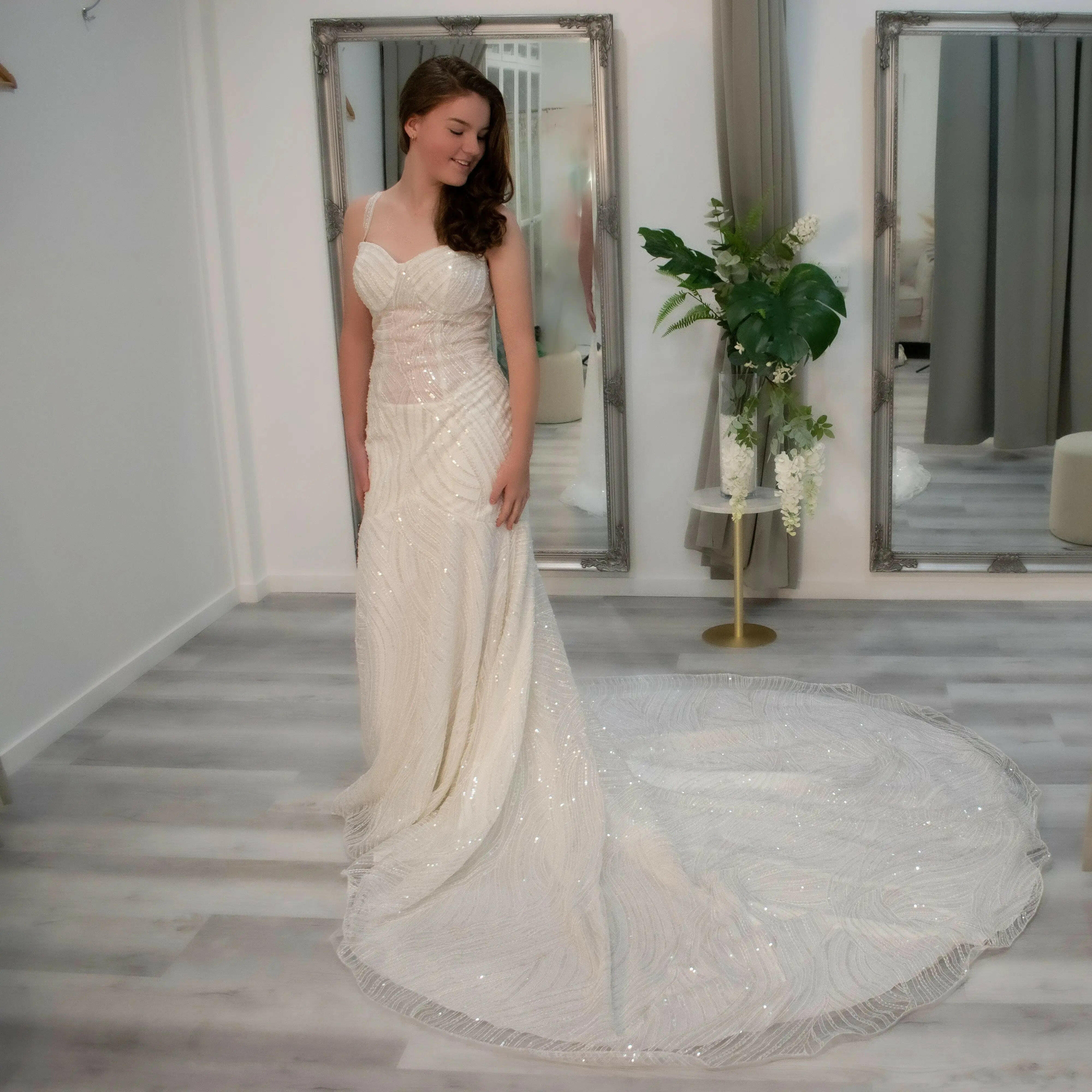 Enchantia is not just a wedding dress; it's the epitome of ethereal beauty. It effortlessly blends modern sophistication with classic allure, making it the go-to choice among wedding dress shops near you. As you glide down the aisle in this enchanting gown, be prepared for all eyes to be on you, captivated by your radiant beauty.