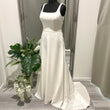 The Aria wedding dress, a paragon of minimalist beauty, instantly captures attention with its effortlessly chic front. A refined square neckline complements the slender, delicate straps, creating an ethereal frame that accentuates a bride's grace. Each detail is meticulously fashioned to emphasize the elegance synonymous with Divine Bridal's wedding dresses.