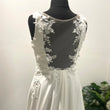 Where the front of the Aria wedding gown whispers timeless elegance, its back speaks volumes. It boasts a captivating illusion design, making this wedding dress truly exceptional. Beginning with a square neckline that seamlessly extends to the waist, the illusion back becomes a canvas for scattered 3-D lace. This whimsical touch imbues the gown with romance and texture.