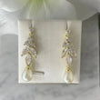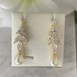 The 'Coco Bridal Earrings Pearl Drop' are a stunning addition to the Divine Wedding collection, blending the natural beauty of pearls with the brilliance of cubic zirconia. These dangle earrings feature delicate leaf-shaped crystals that gracefully lead to a lustrous teardrop pearl, epitomizing bridal sophistication.