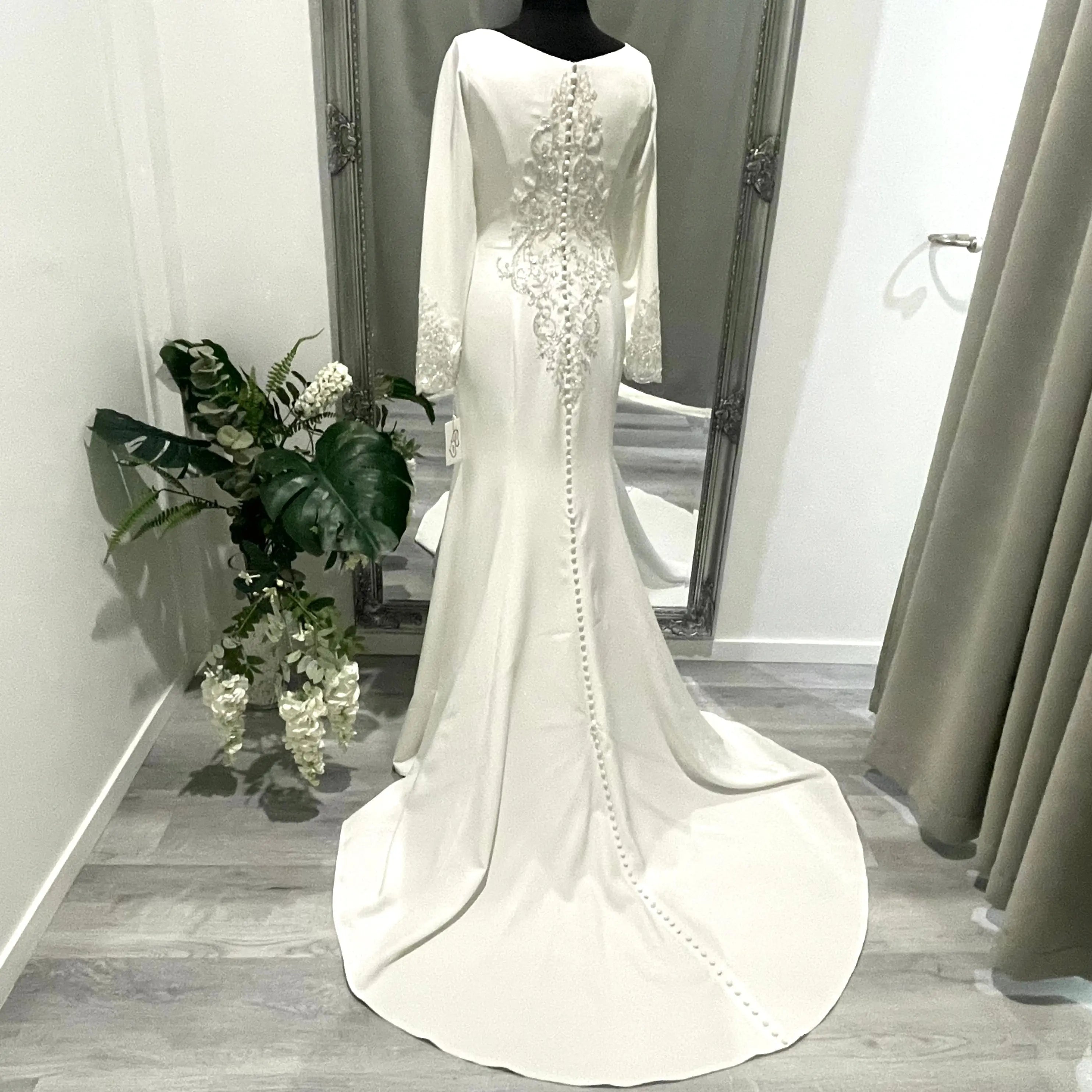 Marta wedding bridal gown is truly elegant and stunning. The jai neckline adds a touch of sophistication, while the sleeves with buttons on the cuff exude a sense of timeless beauty. The cuff of each sleeve is adorned with delicate lace appliqué, adorned with shimmering sequins and silver beads, adding a touch of sparkle to the overall look.