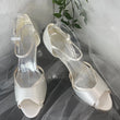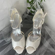 The Stacey wedding bridal shoe is a stylish stiletto with an open toe design and an ankle strap. The heel size of these shoes is approximately 8 cm, making them a perfect choice for brides who want both height and sophistication on their special day.